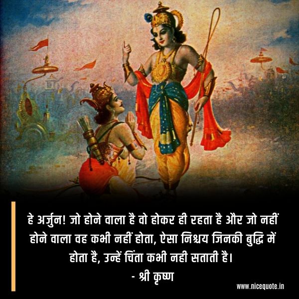 हे अर्जुन! जो होने वाला है वो होकर ही रहता है और जो नहीं होने वाला वह कभी नहीं होता, ऐसा निश्चय जिनकी बुद्धि में होता है, उन्हें चिंता कभी नही सताती है। – श्री कृष्ण (श्रीमद्भगवद्गीता)